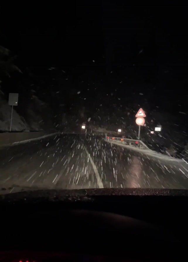 The video depicts a night-time driving scene during heavy snowfall. The view is from inside the car, looking out through the windshield. The road ahead is visible, illuminated by the car's headlights and streetlights. Snow is falling heavily and being cleared by the windshield wipers. Speed limit signs are visible on the side of the road. The car's dashboard is visible, showing the speedometer, RPM gauge, and indicator lights. The environment appears to be a mountainous or hilly area with snow-covered trees.