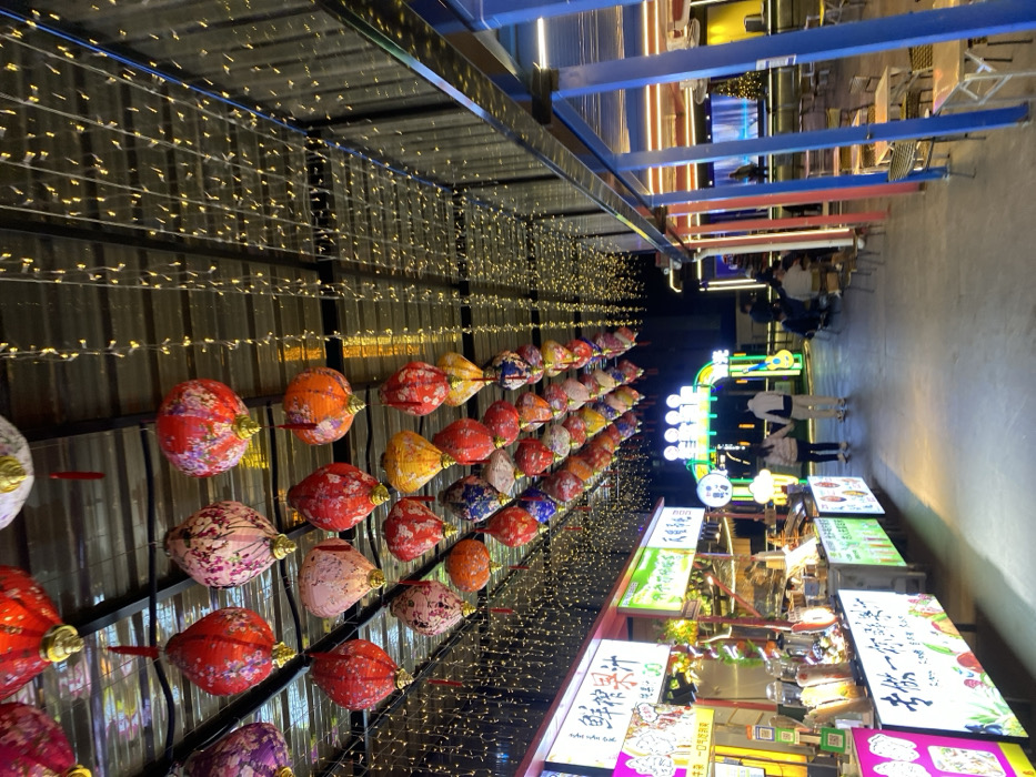 An evening scene within a covered market or food street in Huangpu District, China, is captured from a slightly elevated perspective
