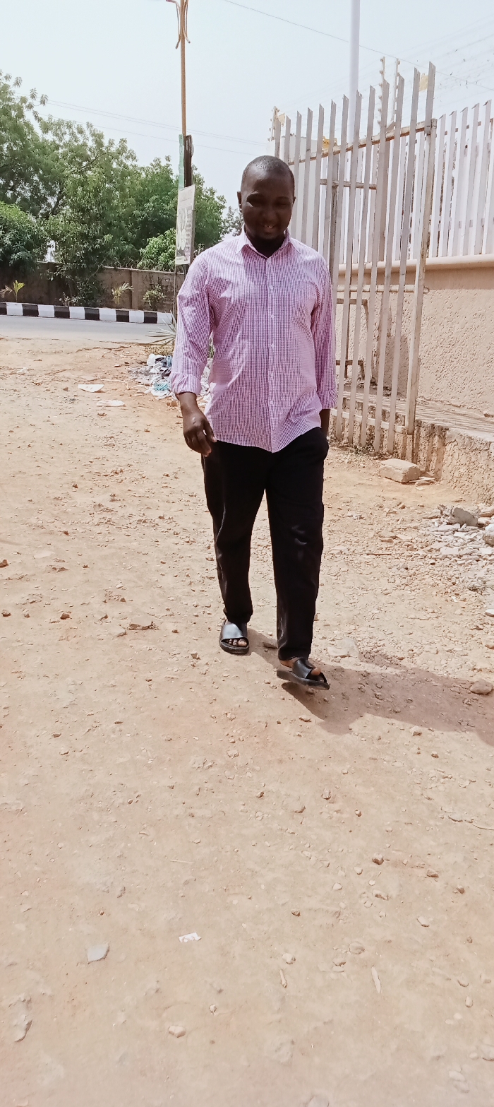 An outdoor scene in Kabala, Nigeria, captured during daylight under bright sunlight, revealing an unpaved area adjacent to a paved road. A single adult male, with a dark complexion and short hair, walks forward on a light brown dirt path. He wears a red and white checkered long-sleeved shirt with sleeves rolled to the forearms, black trousers, and black slide sandals. His right hand is in his pocket, and his left arm is extended slightly forward. A smile is present on his face. To the man's left, a paved road features black and white striped markings, beyond which a low concrete wall and green trees are visible. A light pole stands in the background on the left. To his right, a light-colored metal fence with vertical slats is positioned in front of a tan, textured building wall. The unpaved ground is scattered with small rocks and debris. Shadows are cast from the man and surrounding objects onto the ground.