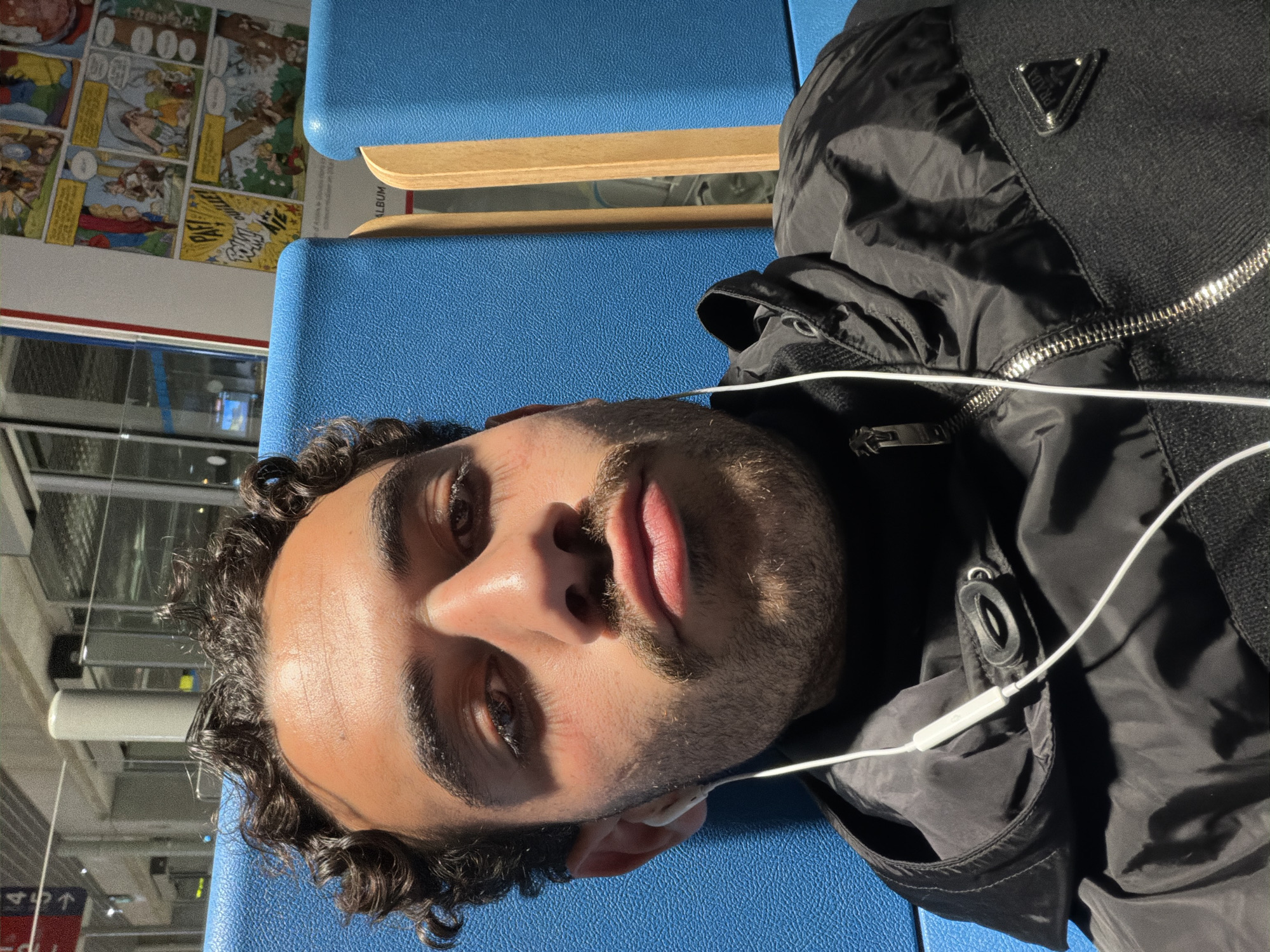 A young adult male, characterized by dark curly hair, brown eyes, and a mustache with stubble, is positioned in a close-up, chest-up selfie. He is wearing a black jacket with a metallic zipper, partially unzipped, and a triangular "PRADA" logo patch affixed to the right chest area. White wired earphones are inserted into his ears, with the cable and in-line control visible across his torso. His lips are pursed in a slight pout, and he is gazing directly into the camera. He is seated on a textured blue airport-style bench seat. In the background, consistent with an airport terminal waiting area, specifically at Nice Côte d'Azur Airport, additional blue seating with a light brown wooden side panel is visible. To the right, a large poster depicting a comic strip with French onomatopoeia such as "PAFF!" and "OUILLE!" is displayed. Further into the background, structural elements of an airport terminal are discernible, including large glass windows, metal supports, and an illuminated sign indicating "4," likely a gate number. The scene is indoors under bright artificial lighting conditions.