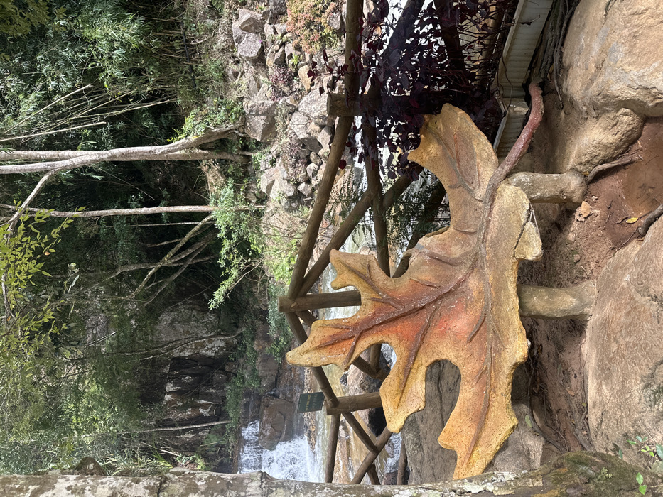 The image features a waterfall surrounded by lush greenery and rock formations. In the foreground, there's a large, artificial leaf sculpture next to a wooden structure, partially obscuring the view of the waterfall. The water cascades down a rocky slope, creating a vibrant scene. The overall composition emphasizes the blend of nature and artificial elements within a scenic landscape.