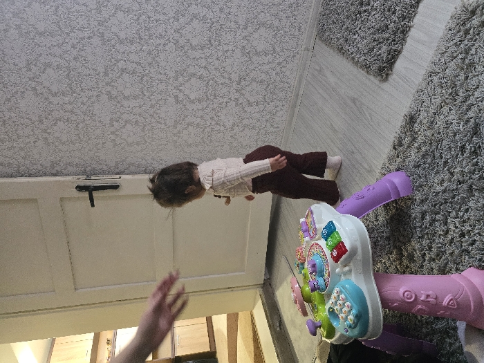 The scene is an interior room located in Petarnitsa, Bulgaria. A toddler, viewed from the back, stands with dark brown hair, wearing a light-colored long-sleeved top with shoulder ruffles and dark reddish-brown pants over white socks. The toddler is positioned near a white panel door, fitted with a black handle, which is slightly open, revealing light-colored wooden cabinets in an adjacent space. To the left, a fair-skinned adult's left hand is visible, extended into the frame. In the foreground, a pink and white infant activity table with multi-colored components (including a turquoise section, small piano keys, and various shapes) is situated on a grey shag rug. The floor consists of light grey wood-look laminate, with sections of grey shag rug. The wall on the right is covered in light grey wallpaper featuring a repeating damask pattern.