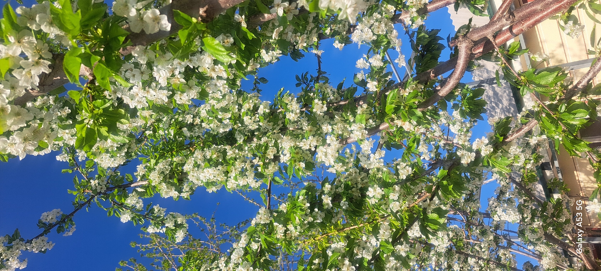 - "tree branches laden with white blossoms and green leaves set against a vivid blue sky" by FM-GhYNt1, licensed under CC BY 4.0