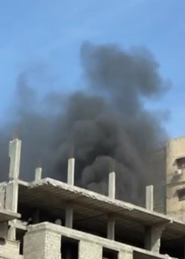 building on fire with a large plume of dark smoke billowing from the top floor. The building appears to be under construction, with exposed concrete and rebar. The sky is blue. There are neighboring buildings visible in the background.