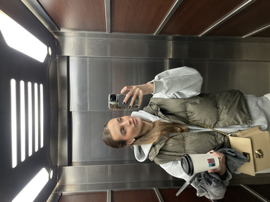 The scene depicts a female individual taking a mirror selfie inside an elevator in Budva, Montenegro. The elevator features stainless steel walls, a brushed metal sliding door, and a dark brown wood-like panel with horizontal metal accents on the right side. The ceiling is black with two rectangular fluorescent light fixtures providing illumination. The subject is a woman with light brown hair, partially pulled back, wearing a light grey hooded sweatshirt and an olive green puffer vest. She has stud earrings and dark nail polish. She holds a smartphone with a reflective gold-toned case and a black textured grip accessory in her right hand, angled towards herself to capture the reflection. Her gaze is directed slightly to her left. In her left hand, she holds a white disposable coffee cup with a black lid, which has a small red and blue logo on its side. Below the cup, she clutches a crumpled piece of grey fabric, possibly an item of clothing. A light beige shoulder bag with a gold chain strap and a gold-colored clasp hangs over her left shoulder.