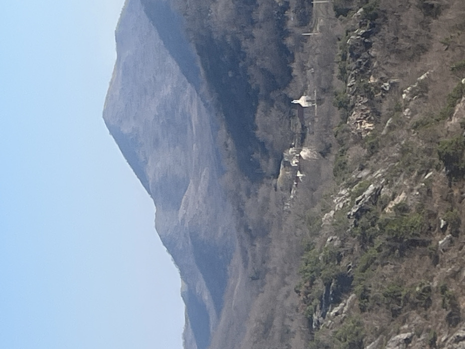 The image displays a panoramic view of the mountainous and hilly landscape of Čelobrdo, Montenegro, under a clear, light blue sky. In the foreground, rocky outcrops are covered with sparse vegetation, predominantly bare deciduous trees and some green shrubs, suggesting a cooler season. The midground features a valley containing a small cluster of structures identified as the village of Čelobrdo. A prominent white building resembling a church or chapel, characterized by a distinct bell tower or spire, is visible on the right side of the village cluster. Several other lighter-colored, likely residential buildings are scattered within the valley. Two vertical utility poles are discernible near the church. The vegetation in the midground consists primarily of bare trees. The background comprises multiple layers of receding hills and mountains, appearing muted in color due to distance or haze, with a prominent peak positioned centrally in the upper background. No individuals are visible. The scene is illuminated by natural daylight, with shadows present on some mountain slopes.