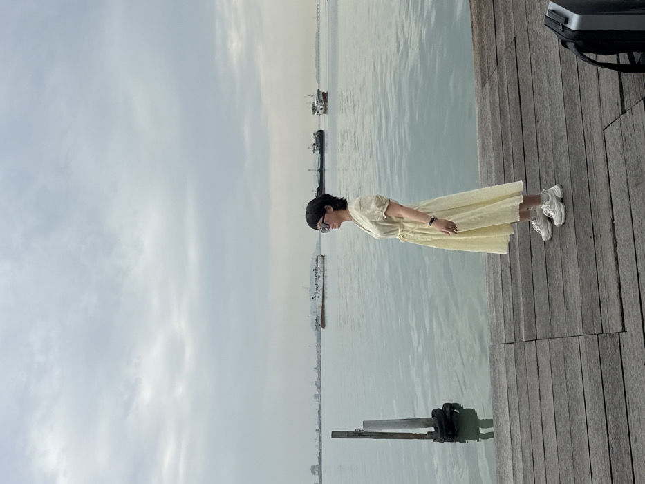 A woman in a yellow dress stands on a wooden pier, looking out over a calm body of water. Several boats are visible in the distance. The sky is overcast, creating a soft, diffused light. To the right of the woman, a gray suitcase rests on the pier. The woman wears glasses and a watch. Her white sneakers are also visible.