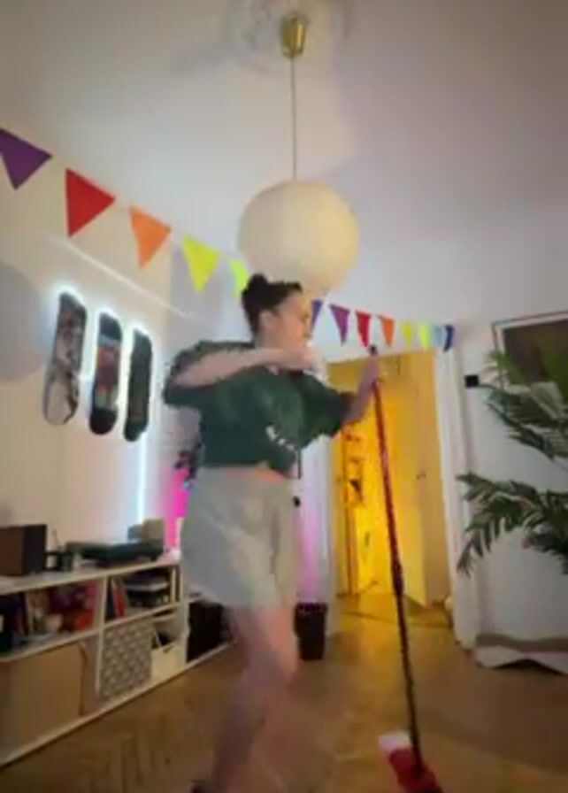 A woman is dancing with a mop in a room decorated with colorful pennants. She is wearing a green t-shirt tied at the front and light grey shorts, and her hair is pulled back. She is using the mop as a prop, holding it like a microphone at times. The room has a wooden floor, a white pendant light, and a shelf with various items. There are also three skateboards mounted on the wall and a large potted plant in the corner of the room. An open doorway leads to a brightly lit room in the background.