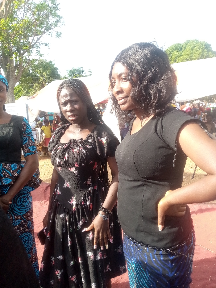 Three women stand outdoors. The woman on the left is wearing a blue patterned dress and a head covering. The woman in the center is wearing a black dress with a butterfly pattern and a beaded bracelet. The woman on the right is wearing a black top and a blue patterned skirt, and her hand is on her hip. Tents and people are visible in the background.