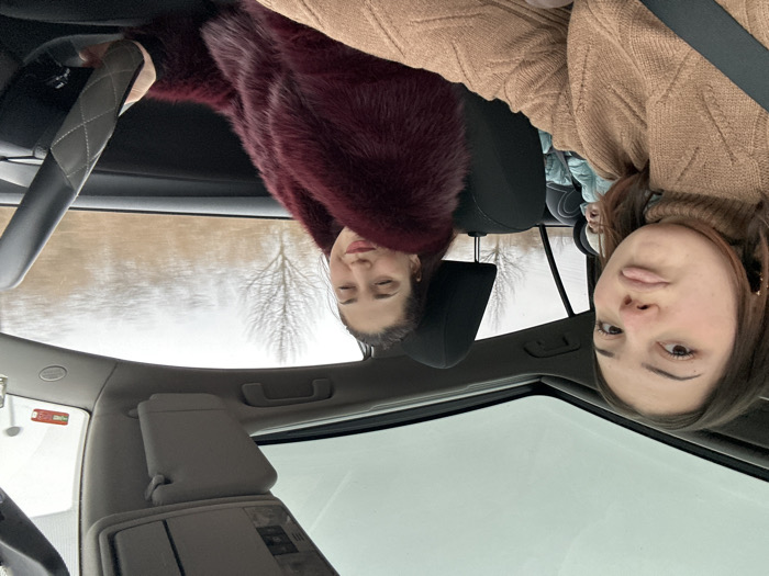 Inside a moving vehicle in Mundolsheim, France, three individuals are present. A young adult female, positioned as the front passenger on the left, wears a tan knitted turtleneck and a seatbelt across her chest. She faces the camera with pursed lips. Her left arm rests on her lap, partially obscuring the lower half of her torso. To her right, a second female, likely the driver, wears a burgundy fur-like coat. She holds the steering wheel with her right hand, her face partially obscured by her hair, and exhibits a slight smile. Visible in the rear seat behind the front passenger is a child secured in a car seat, wearing a light blue puffy jacket. The vehicle interior features a panoramic glass roof and a grey sun visor above the driver's side. The exterior environment, visible through the windows, indicates an overcast sky and a blurred roadside with bare trees and brown vegetation, consistent with the vehicle being in motion.