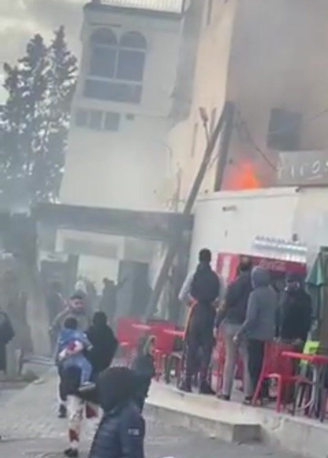 scene outside of a building where there is a fire. The building appears to be a restaurant or cafe, with tables and chairs set up outside. There is a sign that says "TACOS" on the building. Smoke is visible in the air, and flames can be seen coming from the building. A crowd of people is gathered around, watching the fire. Some of the people are carrying children. The sky is cloudy and the weather appears to be overcast.