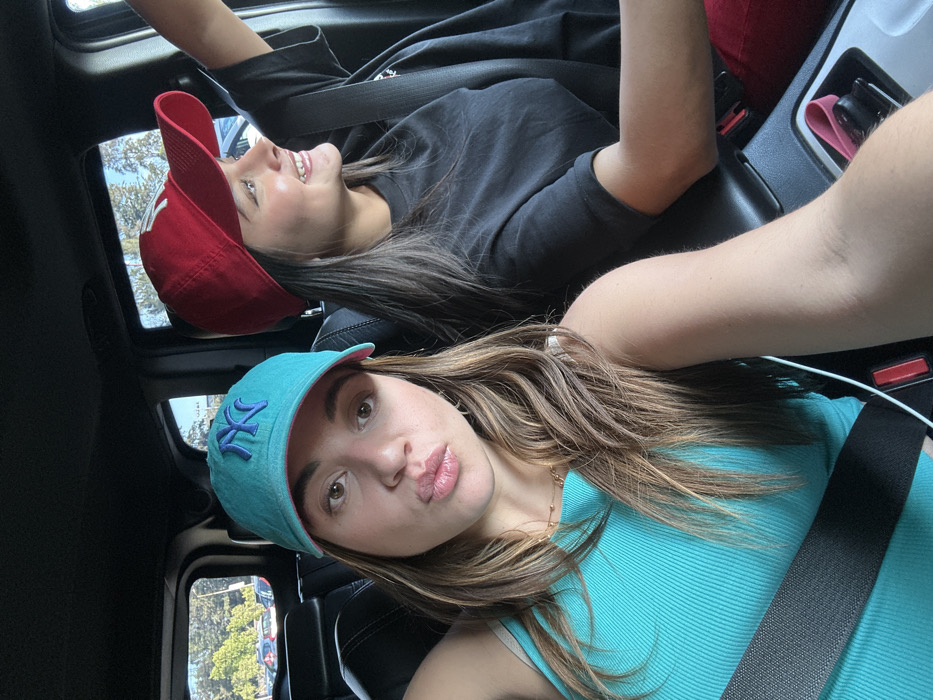 Two young women take a selfie inside a car with an open sunroof. The foreground woman wears a turquoise New York Yankees baseball cap and a matching tank top. She's giving a kissy face to the camera. Behind her, a woman wearing a red Yankees cap smiles upward towards the sunroof. Both are wearing seatbelts. The car's black interior is visible. Outside, trees and buildings can be seen through the sunroof and windows.