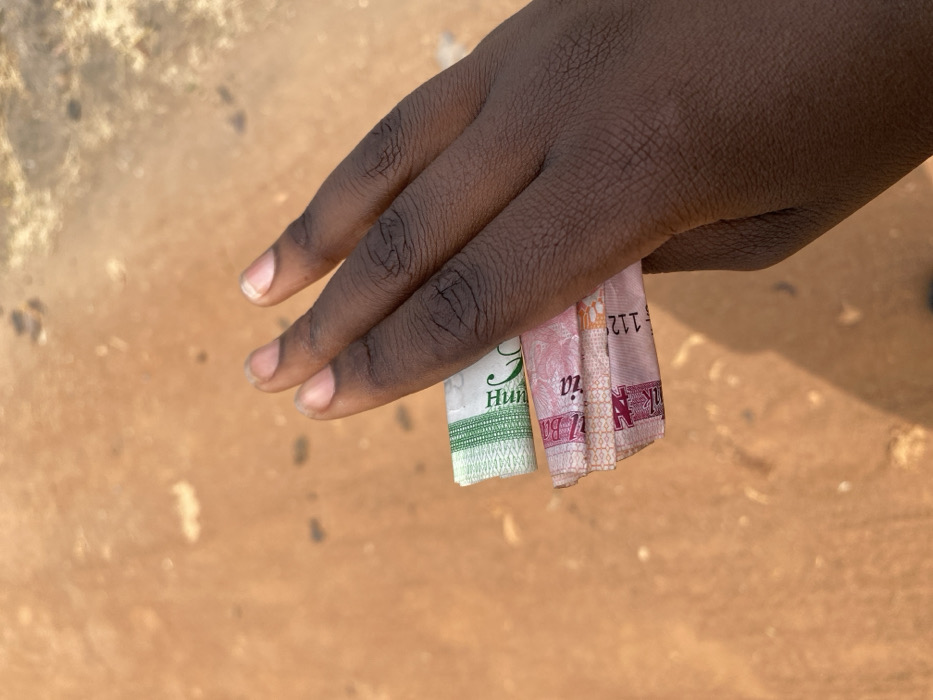 A dark-skinned human hand is centrally positioned, holding a stack of folded Nigerian Naira banknotes