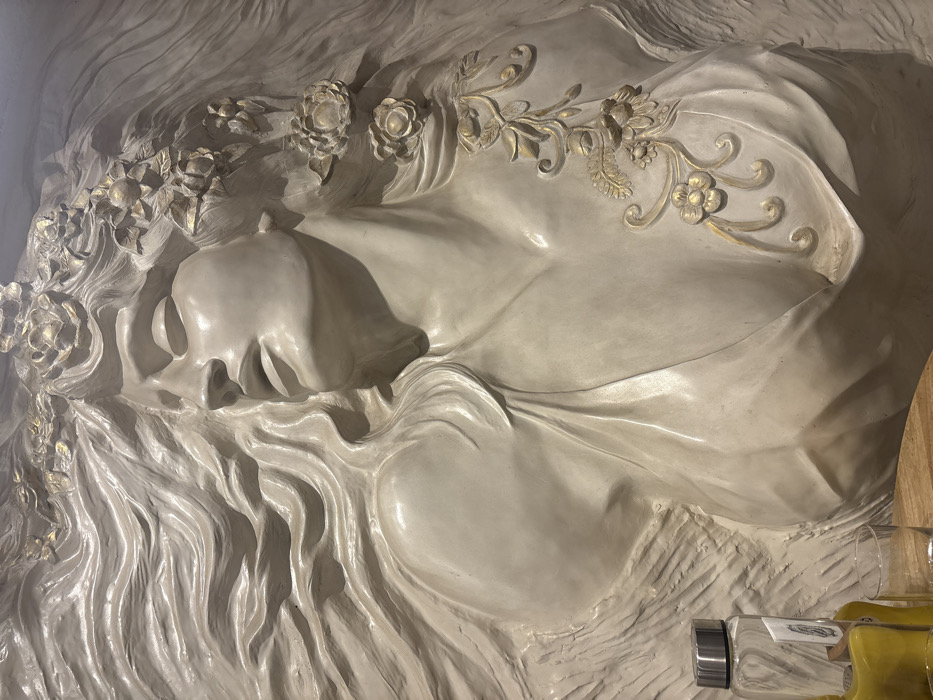 A relief sculpture depicts a woman lying on her side, adorned with flowers and foliage. Her face is serene, with eyes closed in repose. The sculpture is off-white with gold accents highlighting floral details. The subject's flowing hair merges with the surrounding texture, creating a seamless effect. A glass jar with olive oil can be seen on the right.