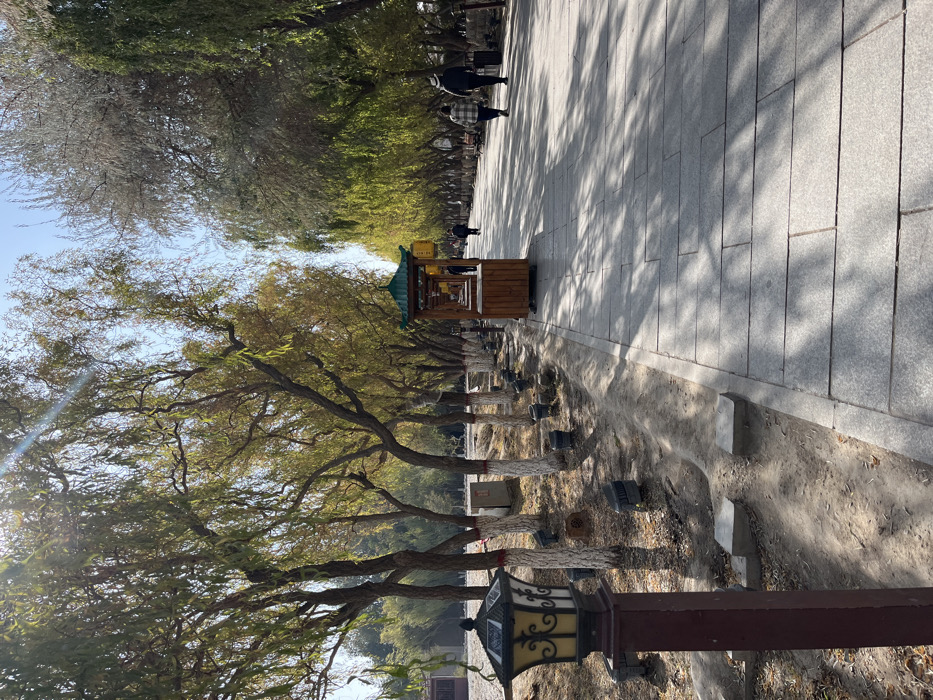 The image depicts a paved promenade within the city of Jiayuguan, China, under clear, sunny skies. The perspective is looking down a wide, light-grey stone-slab pathway lined on both sides by trees with slender trunks and branches bearing green and yellowing foliage, characteristic of autumn. The tree trunks on the left side are partially whitewashed, and several dark, cylindrical spotlights are positioned near their bases in a dirt strip adjacent to the pathway. In the immediate foreground on the left, a dark brown lamppost with an ornate, yellowish, solar-powered lantern is visible. Further along the left side, a row of wooden vendor stalls or kiosks with dark green, pagoda-style roofs extends into the distance. Yellow lanterns are suspended from these stalls. On the paved pathway, four individuals are walking away from the camera. In the midground, one person wears a light plaid jacket and dark pants, walking alongside another person in a dark jacket and a dark hat. Two additional figures are discernible further down the path. Sunlight casts distinct, elongated shadows from the trees and objects onto the pathway and surrounding areas.