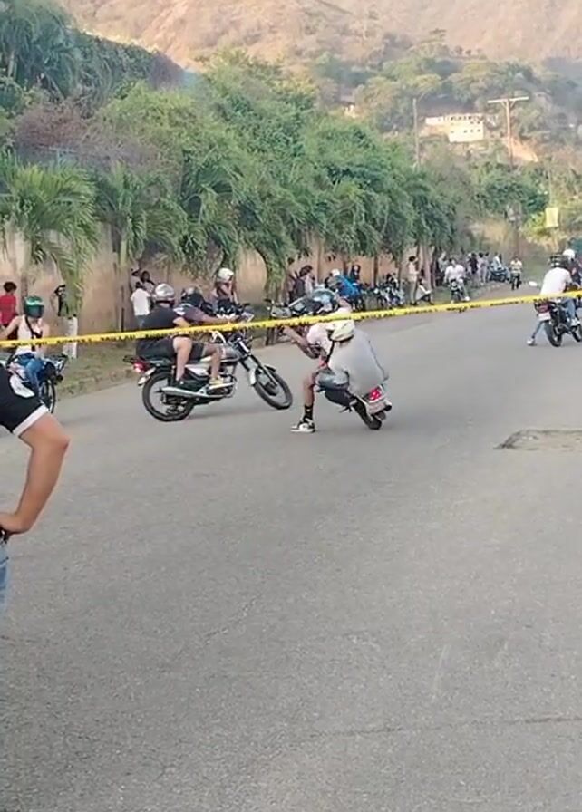 group of people on motorcycles performing stunts on a paved road. The main focus is on a motorcycle with two riders, the driver performing a wheelie. A crowd of people lines the side of the road behind yellow caution tape, watching the motorcycle stunts. Additional parked motorcycles can be seen in the background. In the far distance, there are hills and light green vegetation. The video appears to have been taken during the day in an outdoor setting with a clear sky. A person is also present in the foreground of the video with their back to the camera.