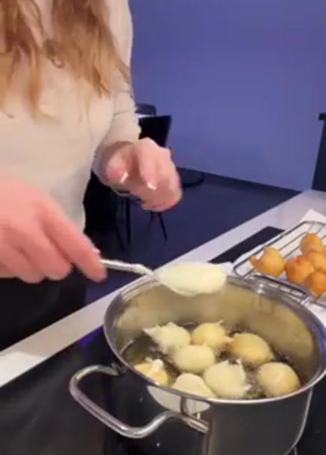 A woman with long, wavy blonde hair is in a kitchen, wearing a white long-sleeved shirt. She is standing in front of a black stovetop. A stainless steel pot filled with hot oil and small, round dough balls sits on the burner. The dough balls are frying and appear golden brown in color. The woman is using a spoon to carefully add more batter to the hot oil. She uses one spoon to scrape the batter off another. To the right, there is a metal rack lined with paper towels, holding a batch of already fried dough balls. The background is a light blue wall. There is a table with a black chair behind her. The kitchen countertop is white.