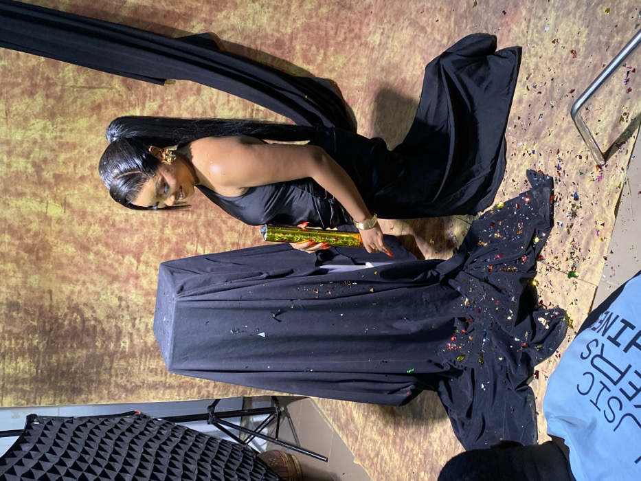 A woman in a black dress kneels behind a rectangular object covered in black fabric. She holds a gold confetti cannon, which has been discharged, leaving colorful confetti scattered on the floor and fabric. The background is a textured brown and gold backdrop. To the right, the edge of a blue shirt with white text is visible. Camera equipment is visible in the lower left corner, suggesting a photoshoot or behind-the-scenes image.