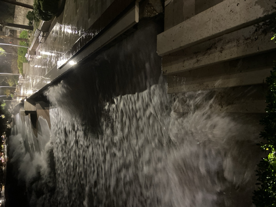 A tiered water feature cascades down concrete steps. The water flows in a blur, suggesting a long exposure shot. Above the waterfall, a reflective, wet walkway is visible, lined with benches. Lush greenery flanks the structure on one side. The overall tone is dark, highlighting the contrast between the flowing water and the surrounding architecture.