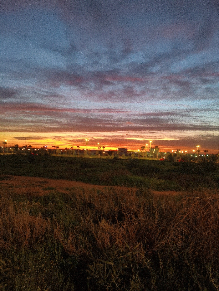 A vibrant sunset paints the sky with streaks of orange, pink, and blue, illuminating distant city lights. Below, a field of dry grass extends towards the horizon, its colors muted by the fading light. The foreground vegetation is dense and textured, creating a sense of depth. The overall scene evokes a tranquil atmosphere with a touch of urban proximity.