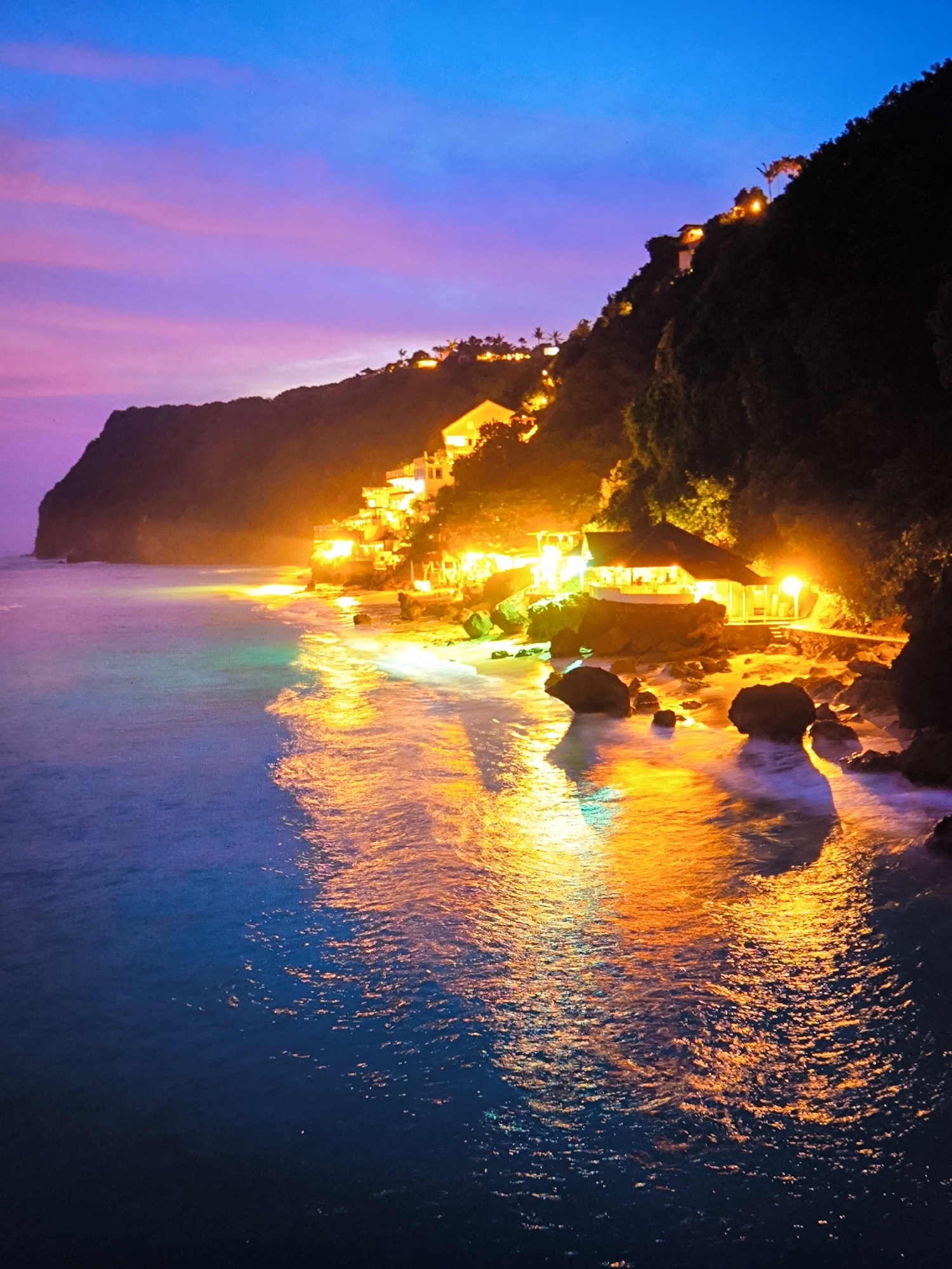 The image displays a coastal landscape at twilight or night, with the location identified as Unknown, Unknown. A steep, dark, and densely vegetated hillside occupies the right and central portions, extending towards the background. Numerous structures, emitting bright, warm orange-yellow artificial light, are integrated into this hillside, some positioned close to the water's edge. These lights create strong, shimmering reflections across the adjacent body of water. The sky transitions from a deep blue at the zenith to pink and purple hues along the horizon. The water surface exhibits ripples and small waves, with white frothy foam visible where waves break near the shoreline. Several dark boulders are present at the water's edge in the foreground. No individuals, specific actions, or interactions are discernible within the frame.