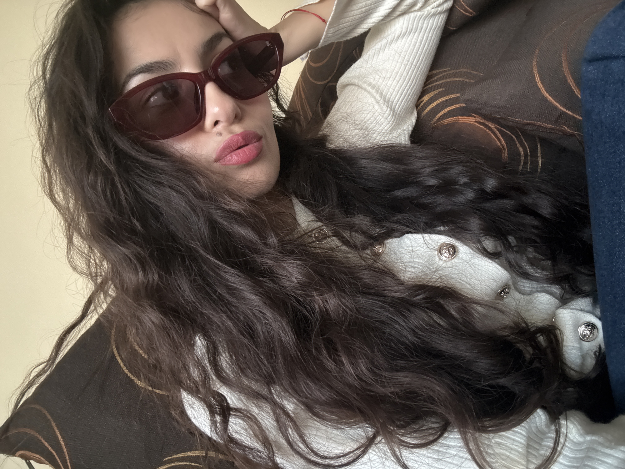 A woman with long, dark, wavy hair is lying on a brown patterned couch. She is wearing dark red sunglasses and a white, long-sleeved, button-up shirt. Her left hand is resting on her head. Part of a blue garment is visible on the right side of the frame. The location is unknown, so a description within Sofia, Bulgaria, cannot be provided.