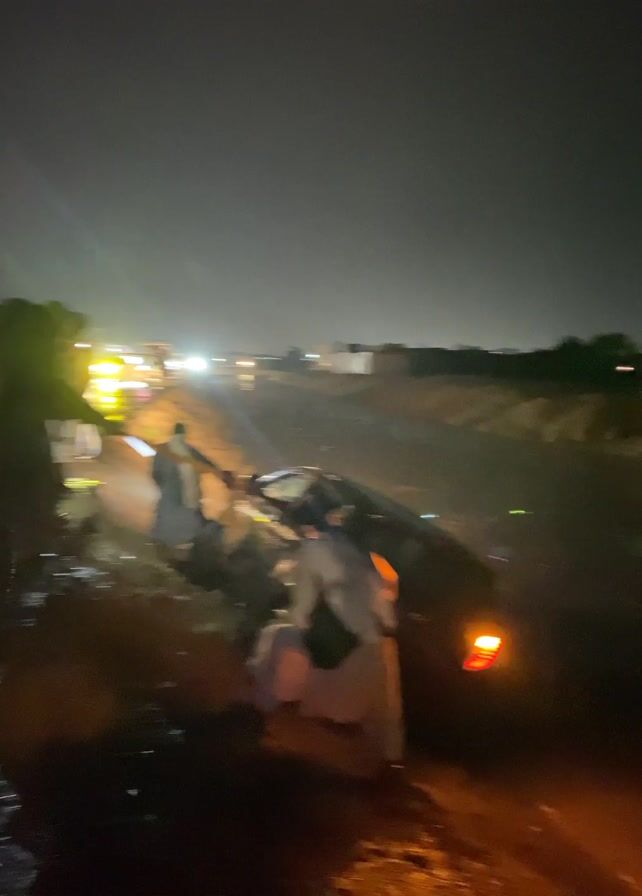 The scene at night shows a dark car that has been wrecked in a ditch