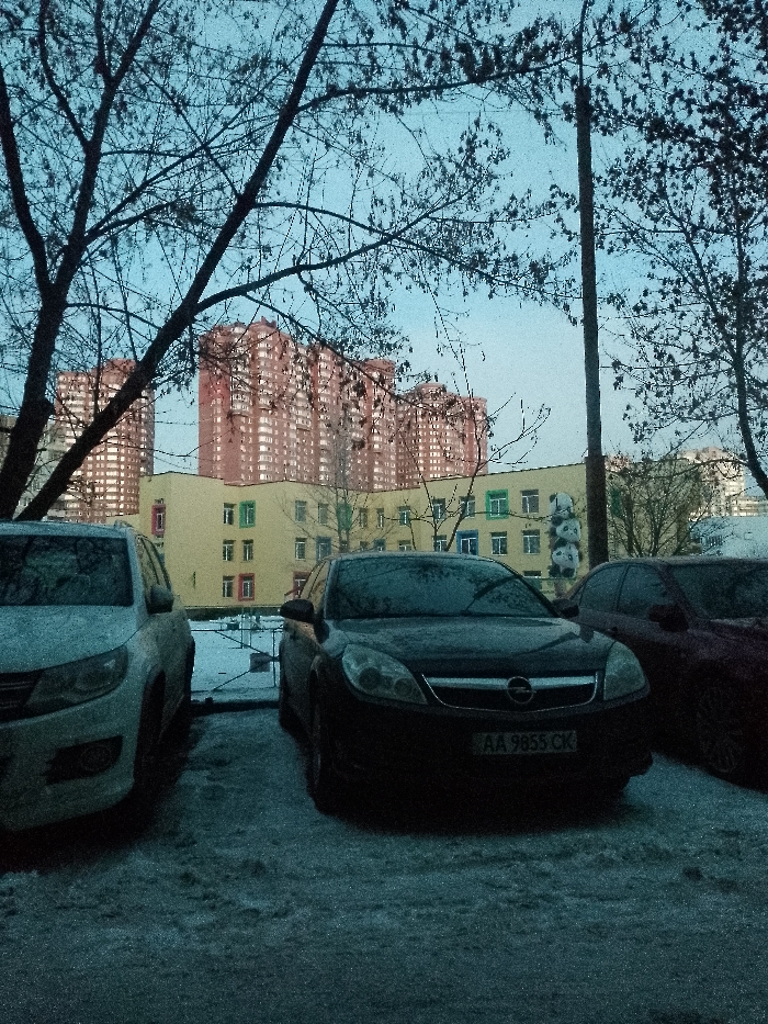- "The image depicts a winter outdoor scene in the Obolon district of Kyiv, Ukraine, under a pale blue sky, with light snow or frost covering the ground and vehicle surfaces" by FM-zDkzX2, licensed under CC BY 4.0