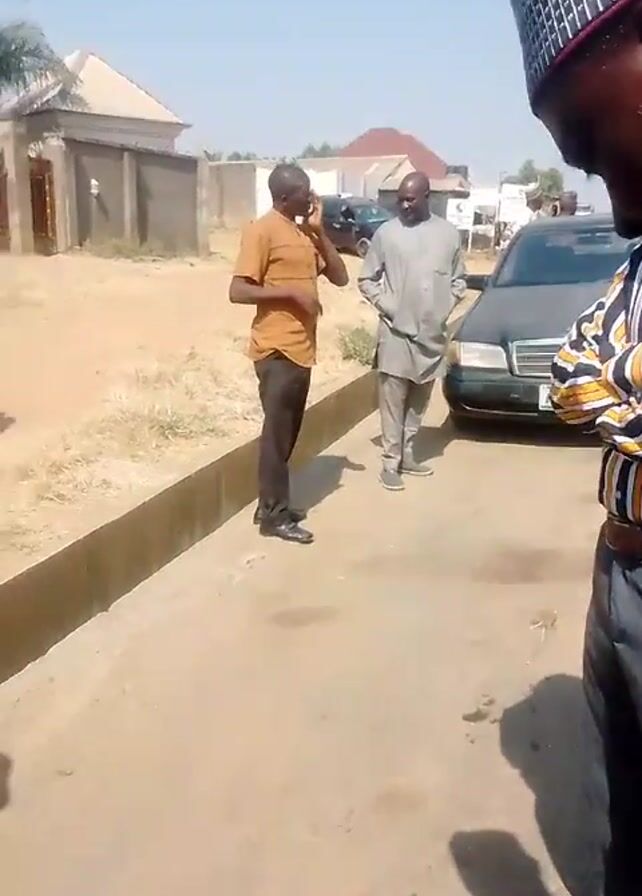 The video depicts an outdoor scene with several men. The men are standing on a paved road or driveway in a residential area. There is a car parked nearby, and houses are visible in the background. Some of the men are dressed in casual clothing, while others are wearing traditional African attire. Some of the men are talking to each other. One man is on the phone. The overall mood seems relaxed and informal.