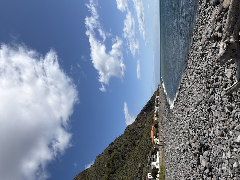 This image depicts a coastal landscape in Ponta do Sol, Portugal. The foreground consists of a wide, dark grey pebbled beach that extends from the lower edge of the frame into the midground. A piece of light-colored driftwood lies horizontally in the lower right, partially obscuring a small cairn of stacked stones. To the right, the dark blue-green Atlantic Ocean meets the beach with a gentle surf line. Along the coastline in the midground, a row of low-rise buildings with white walls and red or orange tiled roofs are visible, marking the edge of a small settlement. These structures are situated behind a low retaining wall. Immediately behind the buildings, a steep, verdant hillside rises dramatically, covered in lush green vegetation, including visible terraced cultivation, likely banana plantations. The upper slope of the hill extends out of frame. The sky, occupying the upper portion of the image, is clear and bright blue, interspersed with scattered white cumulus clouds of various sizes. The overall lighting indicates a sunny day. No individuals or active subjects are present in the scene.