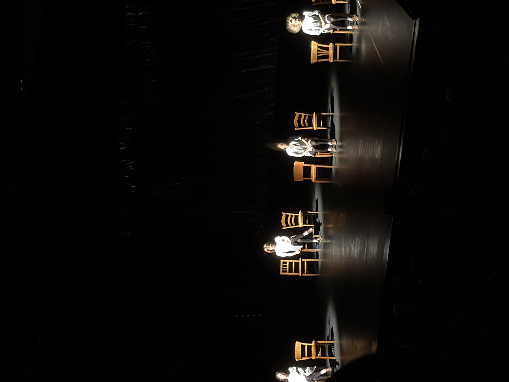 A dark stage with four performers seated on chairs. The stage is illuminated by spotlights. The performers are wearing light-colored tops and dark bottoms. The chairs are wooden. The location is likely a theatre in Villejuif, France.