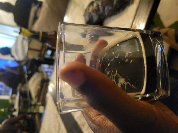 A close-up, first-person perspective image depicts a hand with a dark skin tone holding a clear, faceted glass. The glass contains a dark, opaque liquid, approximately one-third full, topped with a thin layer of light-colored foam and exhibiting residual foam patterns adhering to the interior glass walls. The background is out of focus, revealing an indoor social setting, likely a bar or lounge, characterized by dim lighting. Several indistinct figures of individuals are visible, seated at tables. To the center-right, an individual wearing a light-colored shirt is seated facing away from the camera, behind a dark table. A dark glass bottle is positioned on this table. A blue light source, possibly a television screen or ambient lighting, is present in the far background. The specific location within the city of Jos, Nigeria, cannot be determined from the visual information provided in the image.