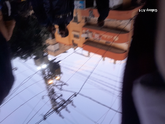 A slightly blurry, rotated street scene. Buildings with orange trim are visible in the background. Power lines crisscross the sky, connected to a utility pole with a bright light. People are seen near the top of the frame, slightly out of focus. The image has a tilted perspective. "Galaxy A14" is imprinted on the top right corner.