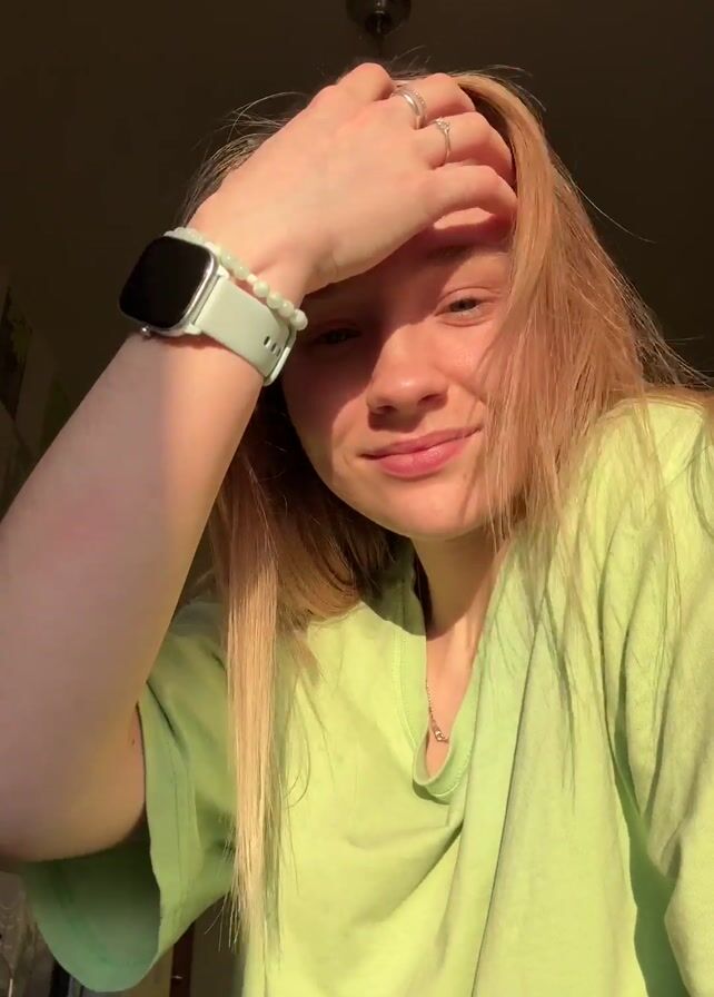 A young woman with fair skin and blonde hair is indoors, bathed in warm sunlight. She is wearing a light green t-shirt and a white smartwatch with light blue accents. She smiles at the camera and runs her hand through her hair, creating a slightly tousled look. She then rests her chin on her hand, gazes towards a light source beyond the frame, and appears to be thinking or contemplating. A decorative light fixture can be seen on the ceiling above. The background includes a patterned wall.