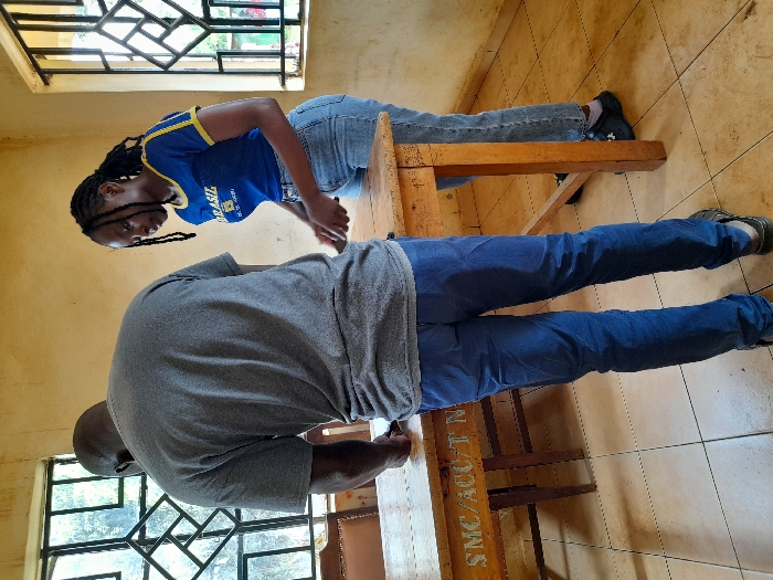Two individuals, a man and a woman, are standing in a room with tiled floors. The man, wearing a gray t-shirt and blue jeans, is facing away from the camera. He is standing to the left of a wooden table with a sign reading "SMC/ACCT/N" and appears to be examining something. The woman, wearing a blue t-shirt with yellow stripes and blue jeans, is standing to the right of the table. She is looking down at something in her hands. There are two windows, one on the left side and one on the right side of the image. Both windows have wooden frames with glass panes and grilles. The room's walls are painted a pale yellow color, and there is a single, brown wooden chair behind the man. The location is likely a school or an administrative office in Siaya, Kenya, as indicated by the coordinates (latitude: 0.057, longitude: 34.28).