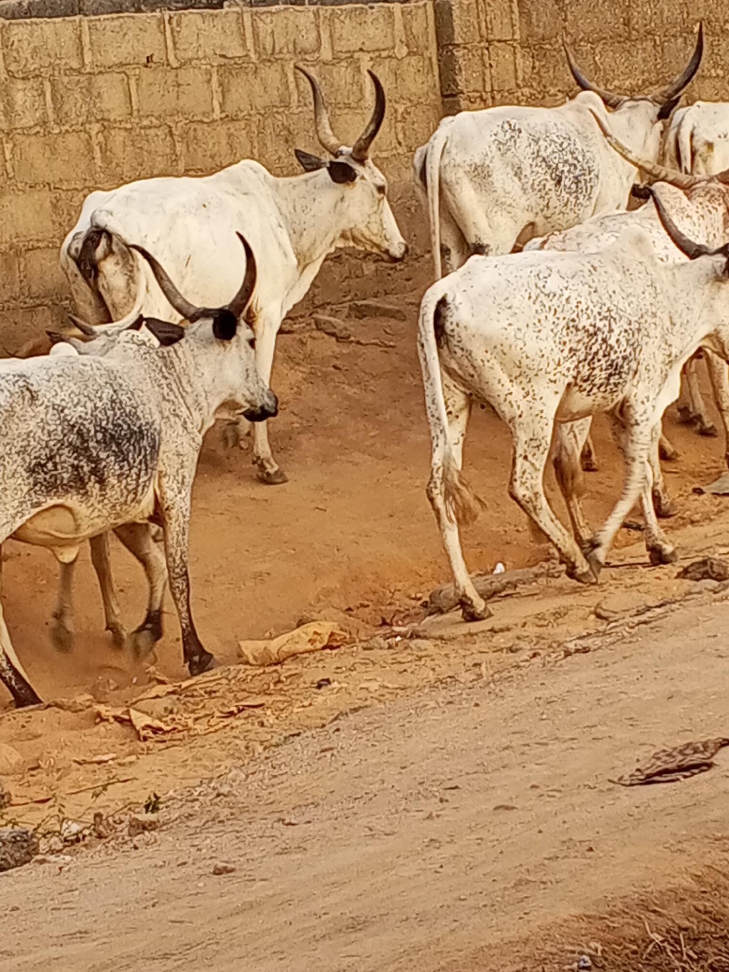 - "A group of light-colored cattle with long horns walks across a dirt path in Adonkolo, Nigeria" by FM-XS7TG3, licensed under CC BY 4.0