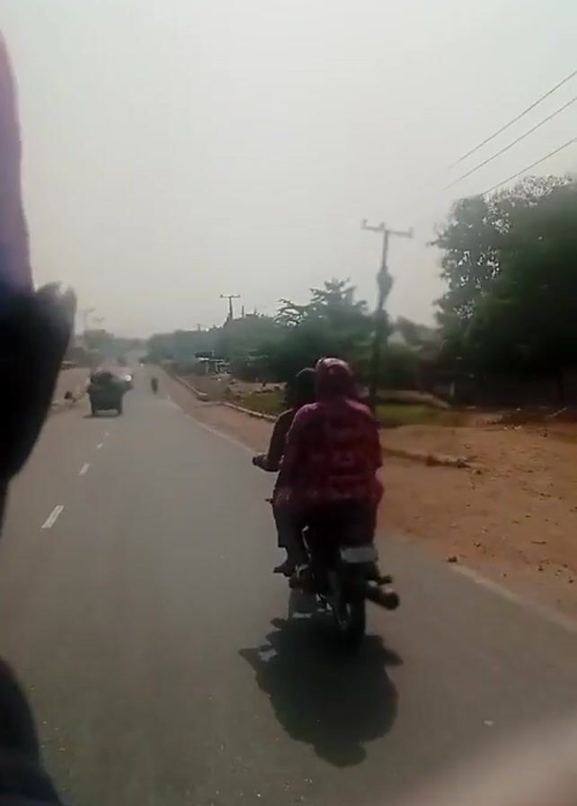 view from the back of a motorcycle moving down a paved road. Two people are on the motorcycle, with the cameraman being one of them. A cart loaded with rocks passes them going in the opposite direction. Utility poles line the side of the road, and there are trees and small buildings visible in the background. The sky is bright, suggesting a sunny day.