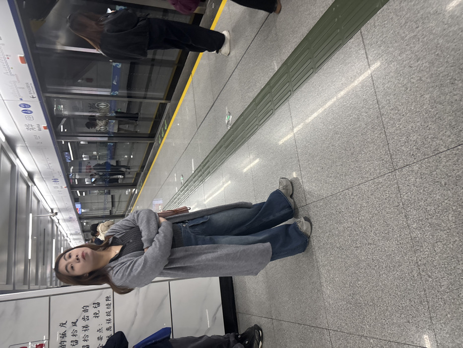 A person wearing a gray cardigan and blue jeans stands on a tiled platform, arms crossed. To their left is a glass-enclosed area, likely a train platform, with reflections of people inside. A tactile paving strip runs along the edge of the platform. A sign is visible on the left side of the image with some Chinese characters on it. The overall setting appears to be a subway station.