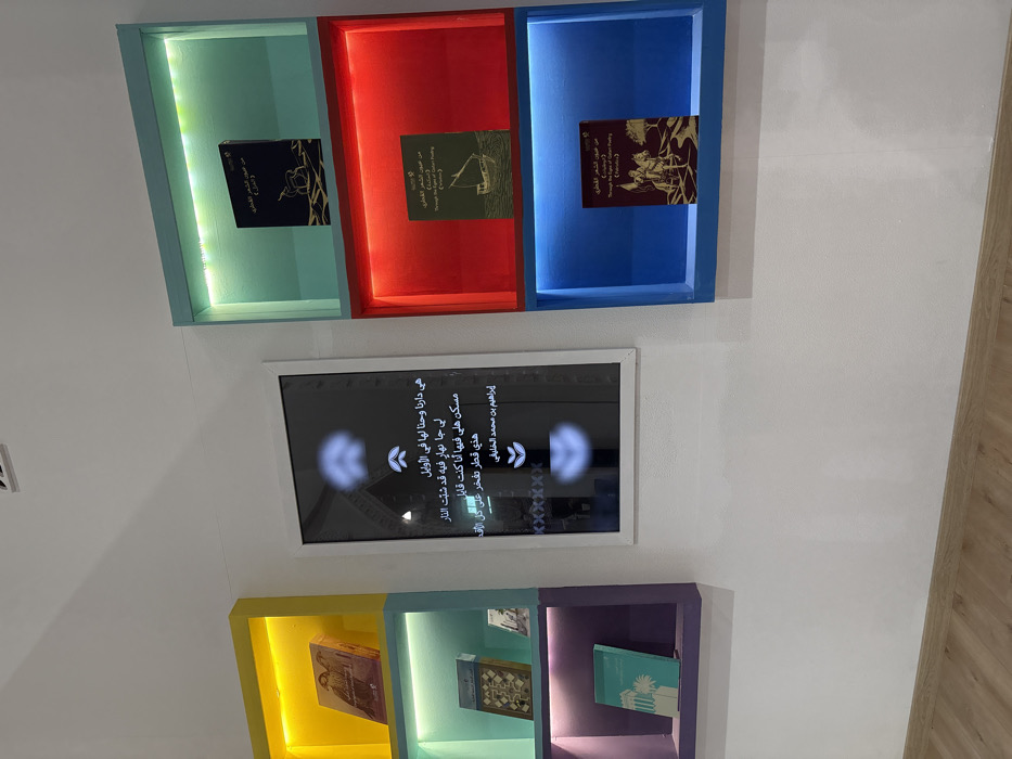 This interior scene, located in Shab'a, Syria, displays a brightly lit exhibition or library wall