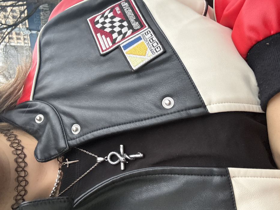 - "A close-up, chest-level view shows an individual outdoors in Gentilly, France, wearing a multi-paneled racing-style jacket over a black shirt" by FM-TSeKd2, licensed under CC BY 4.0
