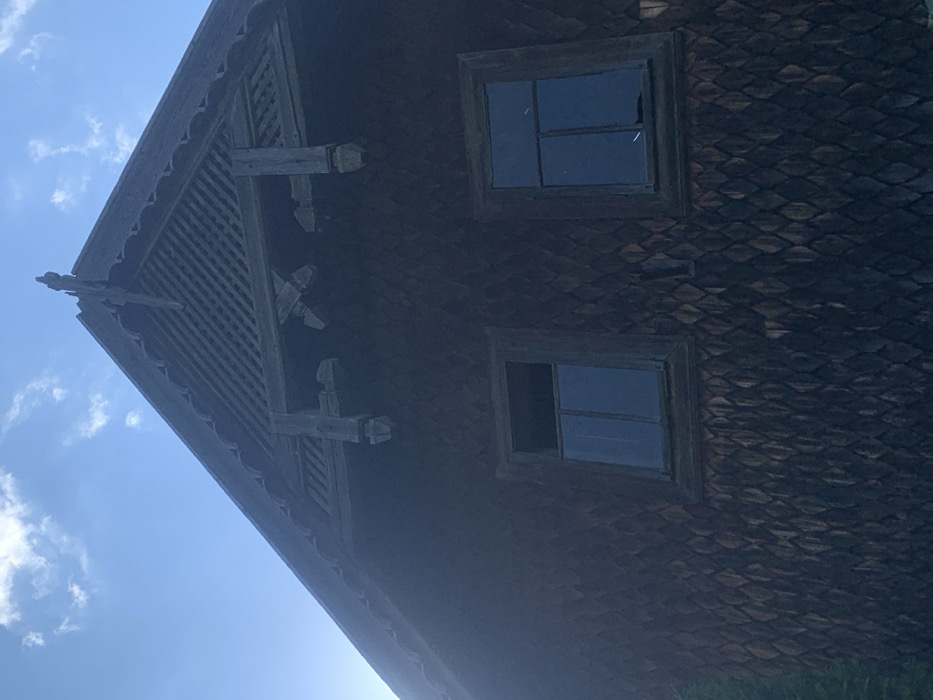 - "The image displays the upper facade and steeply pitched gable roof of a traditional wooden building in Yasinia, Ukraine, viewed from a low angle" by FM-BI1Cp2, licensed under CC BY 4.0
