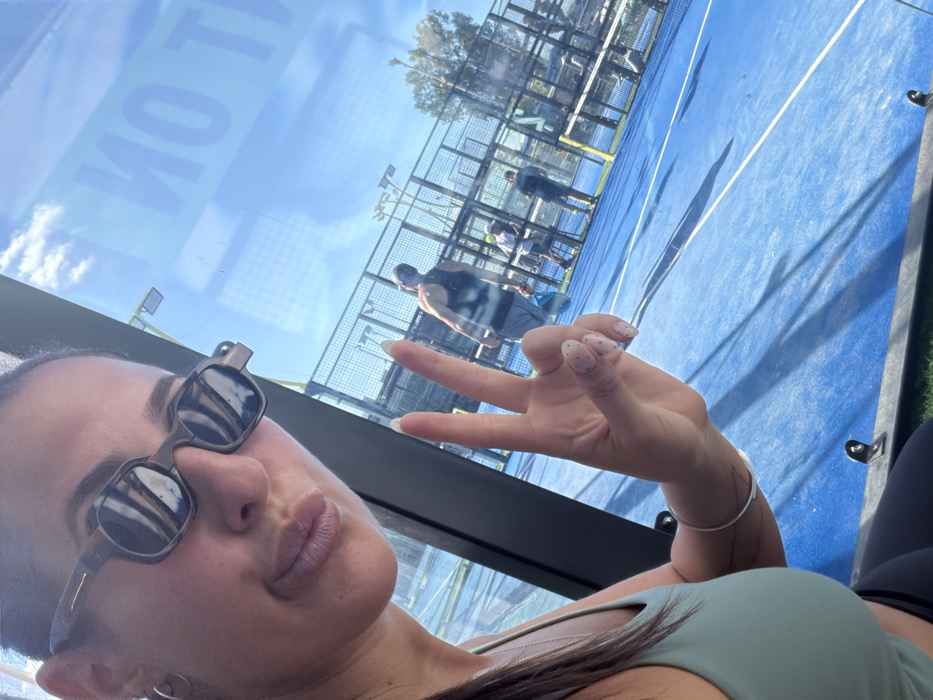 The image depicts a selfie taken from a viewing area overlooking an outdoor padel court in Raanana, Israel, under clear, sunny conditions