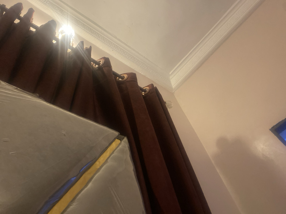 The image depicts an indoor scene within a structure in Sabon Gari East, Nigeria. The perspective is from a low angle, with the frame oriented to show various room elements. In the upper-left portion of the image, a large, rectangular object, consistent with a mattress, is partially visible. It is enclosed in clear plastic wrapping, revealing a grey surface with a prominent yellow band running horizontally along its visible edge. Immediately below this object, a set of dark reddish-brown curtains is displayed, featuring circular gold-colored grommets along their visible upper edge. A bright light source is visible behind the central section of these curtains, emitting a strong glare. The lower-right section of the frame shows a light-colored wall, appearing beige or pale peach. A white ceiling cornice, characterized by a repeating geometric pattern resembling a Greek key design, extends along the right edge of the frame. A localized, irregular patch of discoloration, consistent with a stain or mildew, is observable on the light-colored wall directly below the curtains. A small fragment of a blue object is partially visible in the extreme lower-right corner of the frame. No individuals are present, and no specific actions or interactions are depicted.