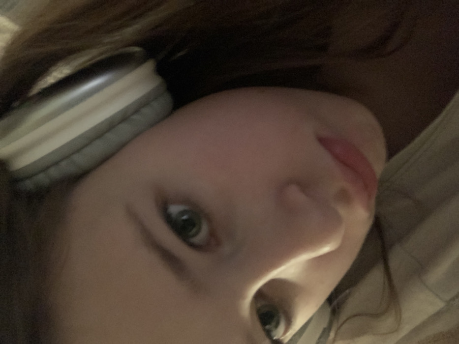 A close-up, angled shot features a fair-skinned person with green eyes and pink lips. Headphones with grey and white stripes rest against the head. Brown hair is visible, and the edge of a striped garment appears on the right. The person is looking towards the camera. The image is somewhat dark and grainy.