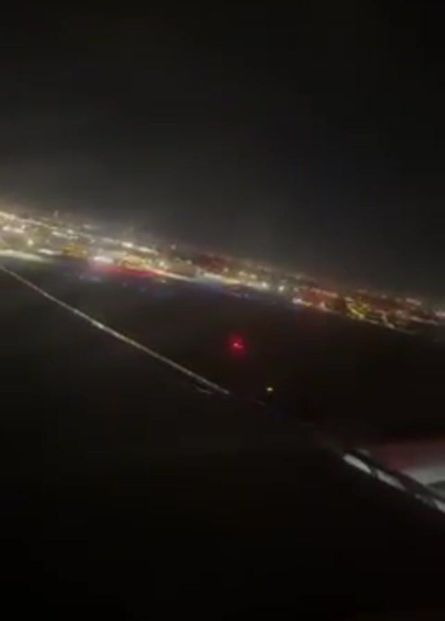 From the perspective of an airplane passenger, the video shows the plane landing at night
