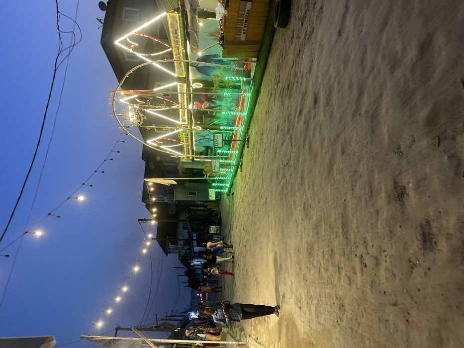 An illuminated amusement ride dominates a street lined with buildings and strung with lights. The ride glows with white, red, and green lights. People sit and stand along the street near the amusement. A dirt or sand-covered road stretches from the ride toward the viewer. The sky transitions from light near the horizon to a darker blue overhead.