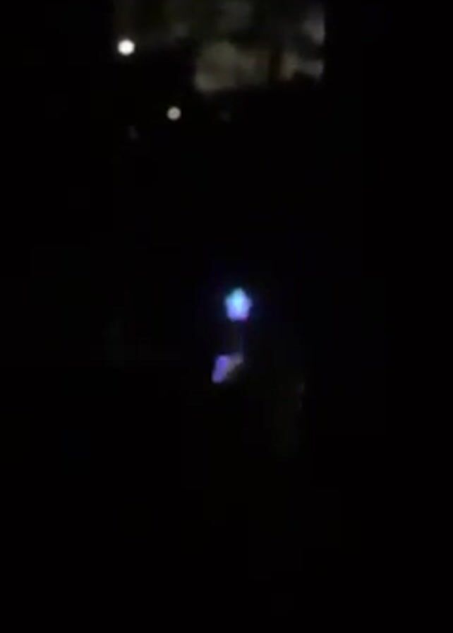 dark scene with a blurred, illuminated object in the center. The object is shaped like a Christmas tree and is decorated with multiple small, colorful lights. There are also two blurred lights in the upper portion of the video. The background is black and appears to be outdoors.