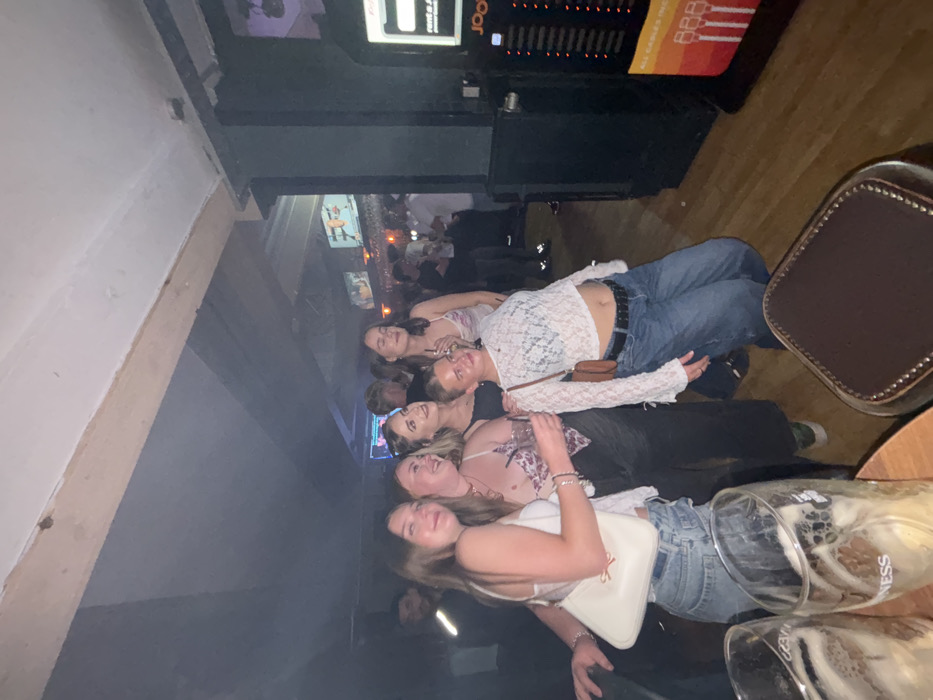 Six young women are posing for a photo in what appears to be a pub. The lighting is dim and there are other people in the background. The women are dressed in casual clothing, including jeans, crop tops, and a white lace top. Some are holding drinks. The scene also shows a jukebox, bar stools, glasses and a television on the wall.