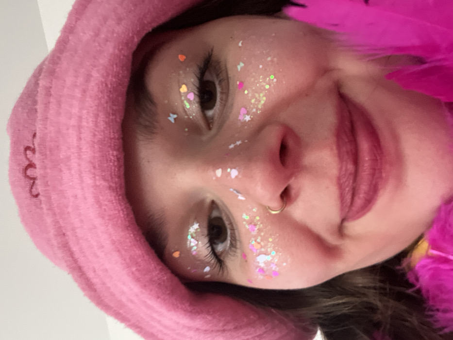A tightly cropped, high-angle portrait focuses on the upper body and face of an individual with light skin, presenting a subtle, closed-lip smile directly to the viewer. The subject wears a textured pink bucket hat, featuring a darker pink embroidered design resembling an 'M' or abstract symbol on the front. Iridescent and multi-colored glitter, shaped as hearts, stars, and butterflies, is prominently applied around the eyes, across the nose bridge, and onto the upper cheeks. The individual has brown eyes and dark pink lipstick. A gold-toned hoop nose ring is visible in the left nostril. A vibrant pink feather boa or similar feathered accessory is partially visible at the bottom of the frame, with a trace of yellow fabric beneath it on the lower left. The background is a plain, light-colored interior wall. The image provides no visual information to ascertain its specific location within Dunkirk, France.