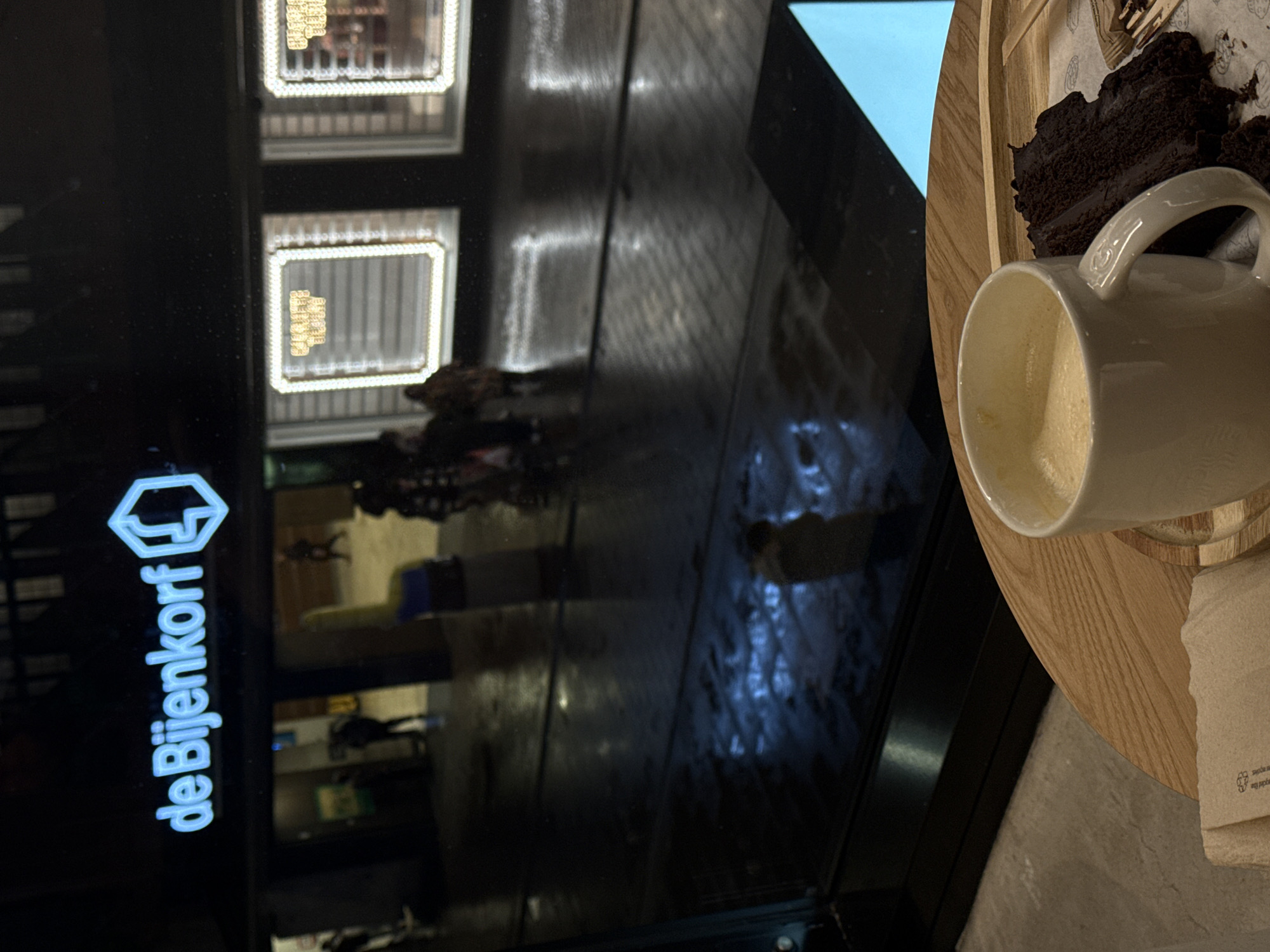 café table with a half-empty white coffee mug, a slice of chocolate cake on a wooden serving plate, and a napkin. The table is likely inside a cafe at the De Bijenkorf department store in The Hague, Netherlands. Reflections in the café window show the store's signage and pedestrians on the street outside.
